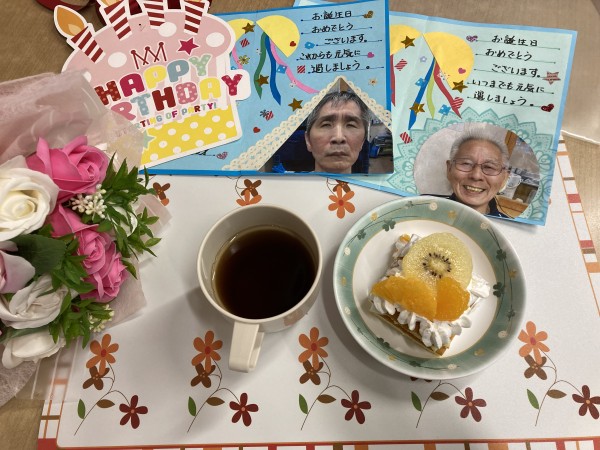 スタッフの手作りケーキにバースデイカードを添えてお祝いをさせて頂きました。