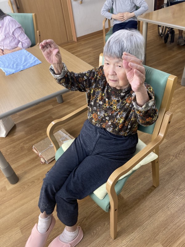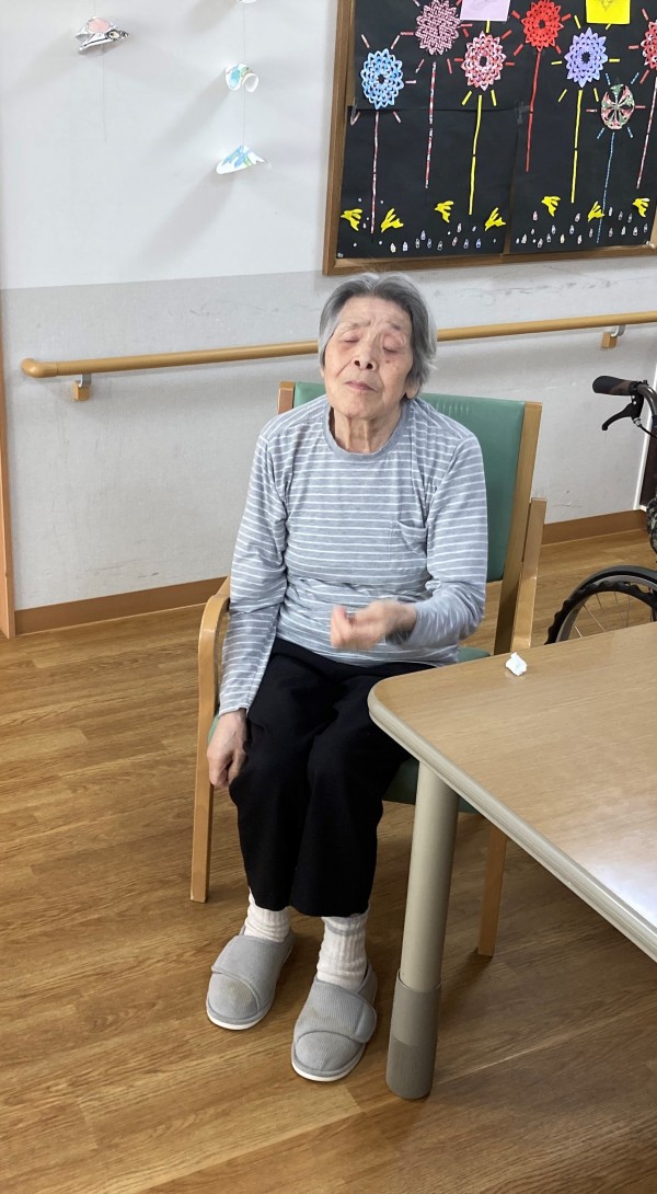 午前の体操の様子です。毎食前の口腔体操や月1回程のリモート体操以外にも、なるべく身体を動かして頂く為にTV番組を活用し体操をして頂いています。これも毎日の日課になっています。