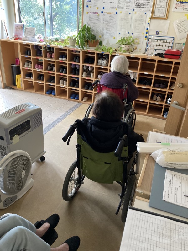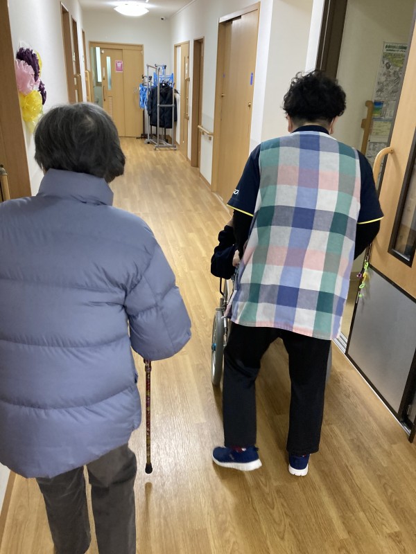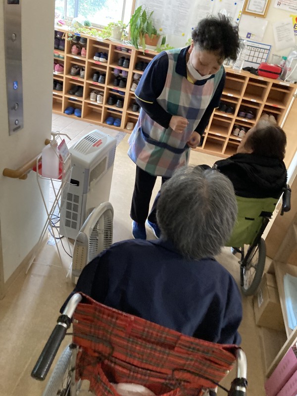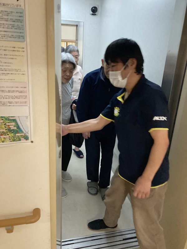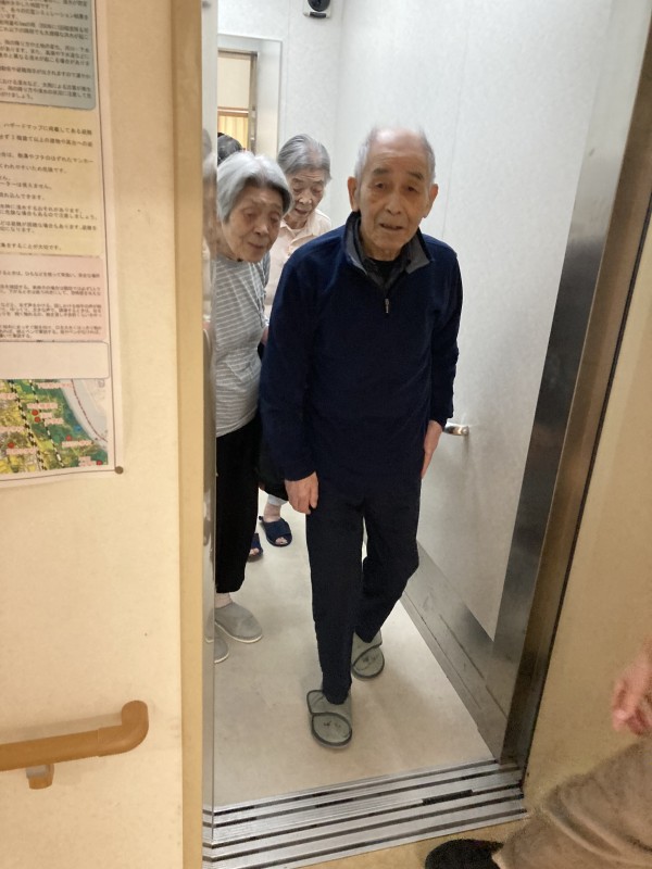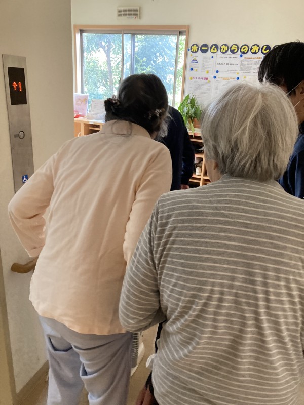 続いて歩ける方は歩いて頂き、車椅子の方は介助にて全員駐車場に集合しました。