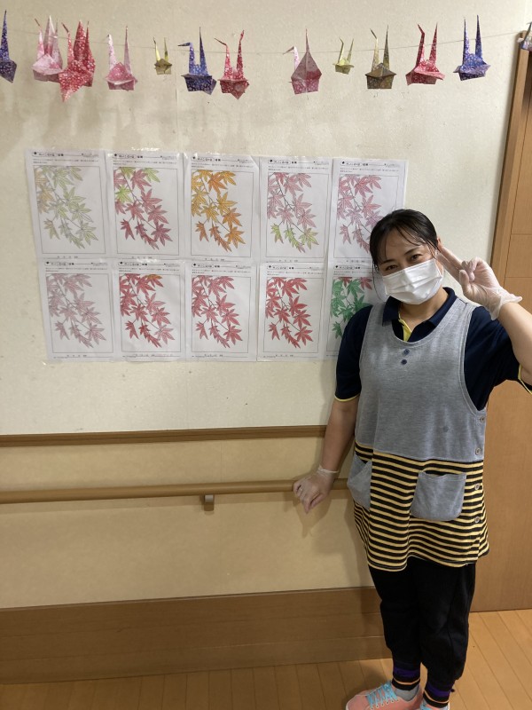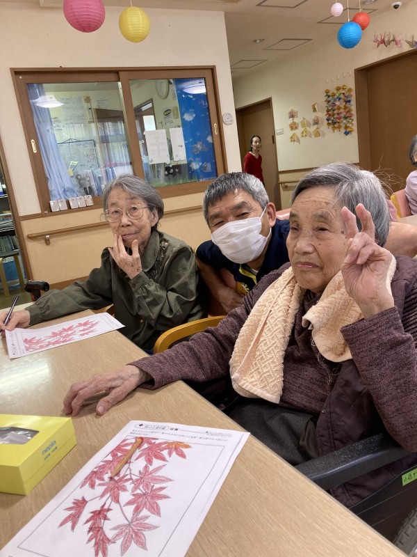 皆さんと紅葉の絵に赤・緑・オレンジ等色とりどり楽しく塗られていました(^◇^)