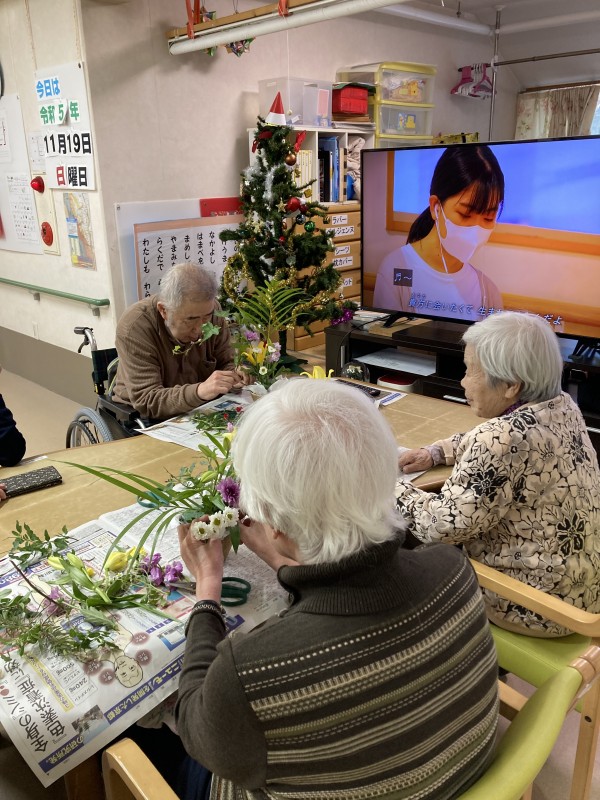 本日は、初めてのフラワーアレンジメント企画で、利用者様とお花(≧▽≦) 小さく可愛い作りや、男性は大きく大胆に作っていました(≧▽≦)