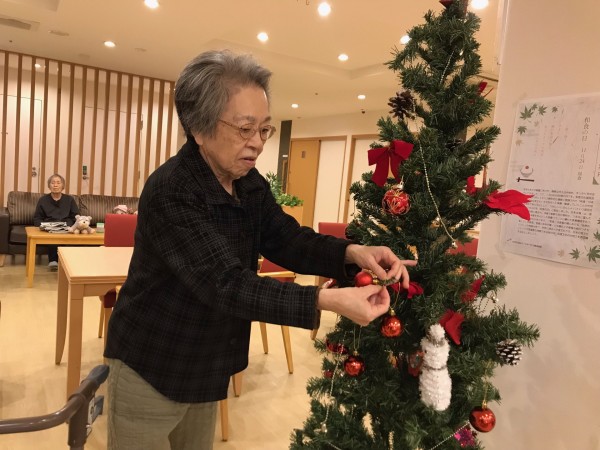 まずは施設内からと考え皆様と楽しくクリスマスツリーに色とりどりのオーナメントを飾りつけをしました。