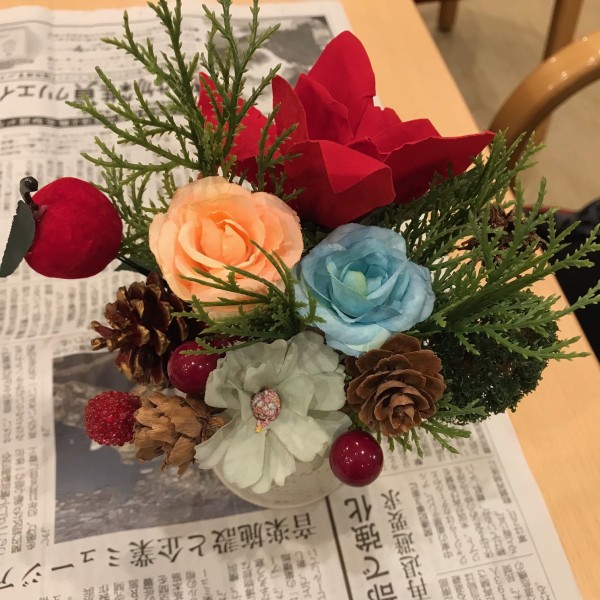 クリスマスフラワーアレンジメントを皆様と一緒に作りました。