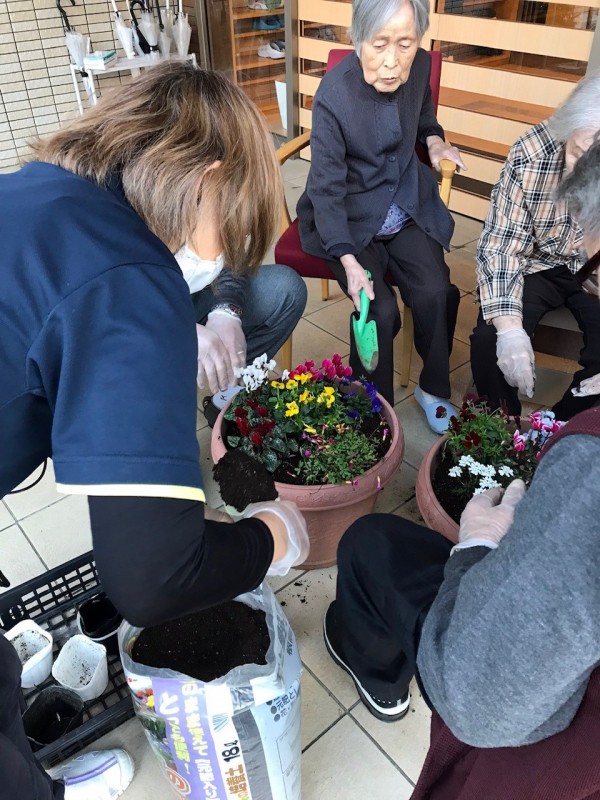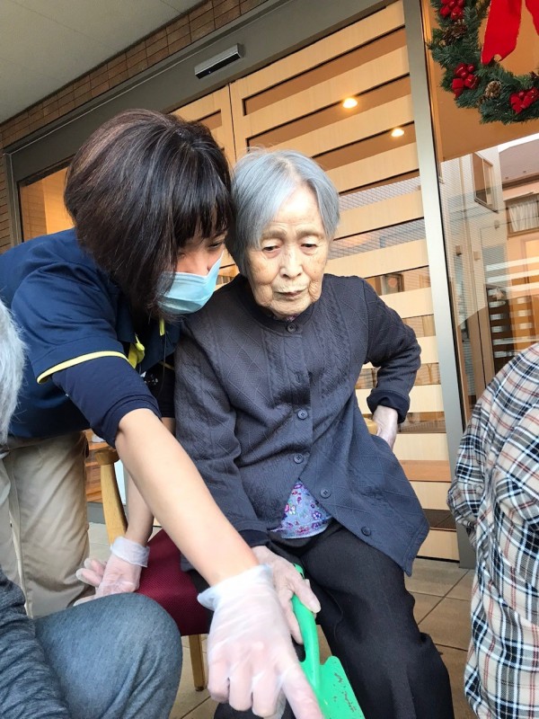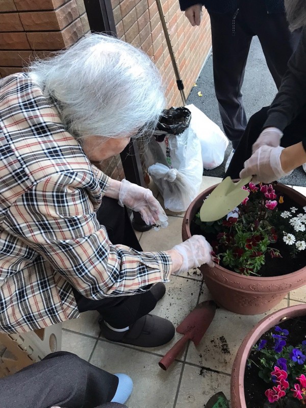 「土いじりが好きだった・・」「昔農家だったから詳しいのよ・・」と楽しそうにシャベルを持ち沢山の入居者様がお手伝い来てくださいました。