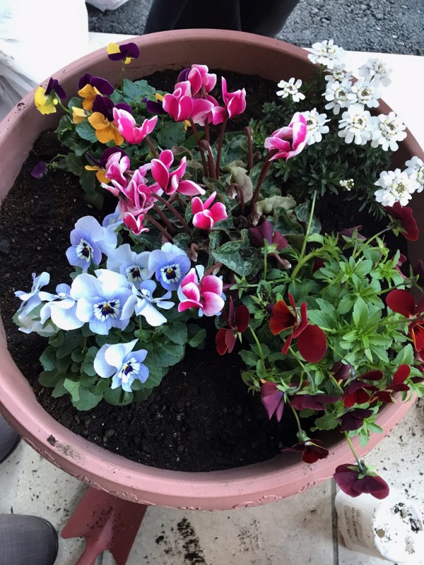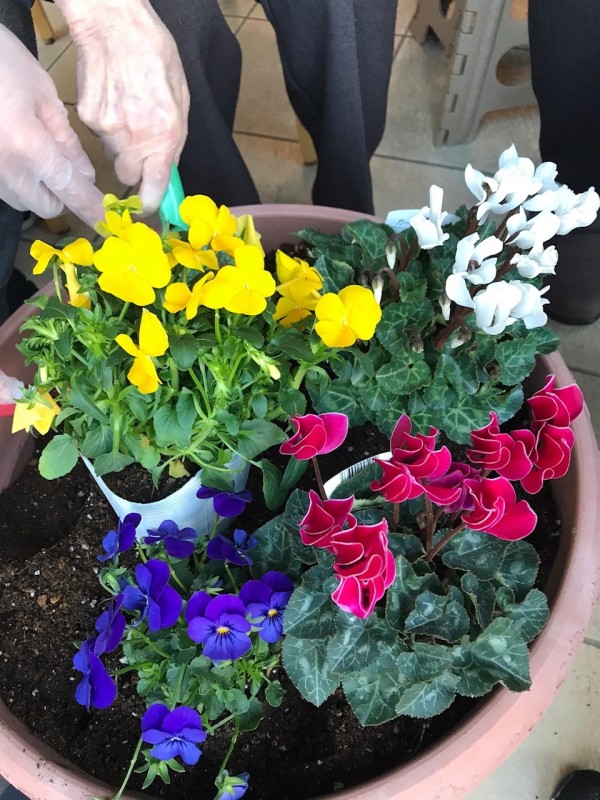 植えながら、「花の色は、青がこっちがいいね。」「赤も綺麗だね。・・やっぱりこっちいいかなぁ・・」と皆さんで相談しながら素敵な鉢植え完成しそうです。