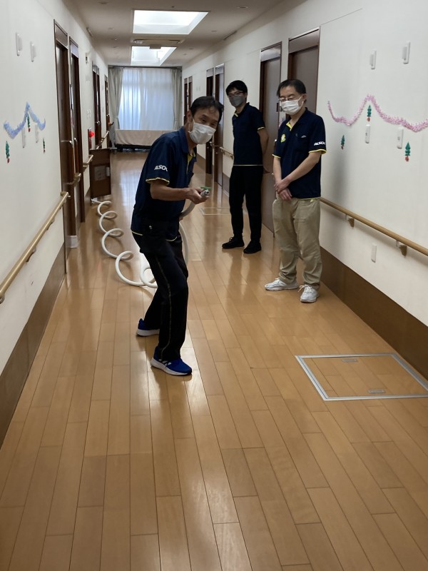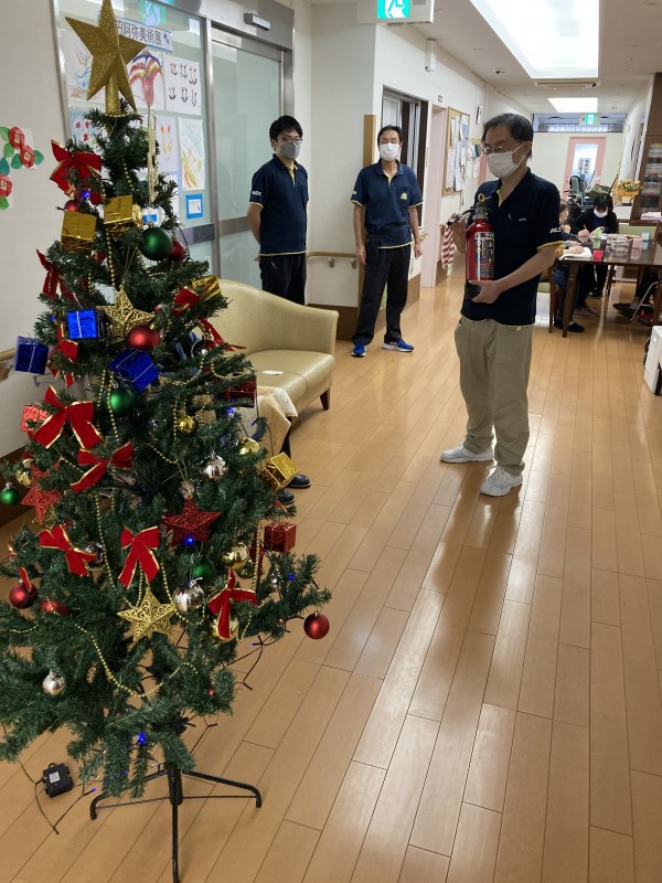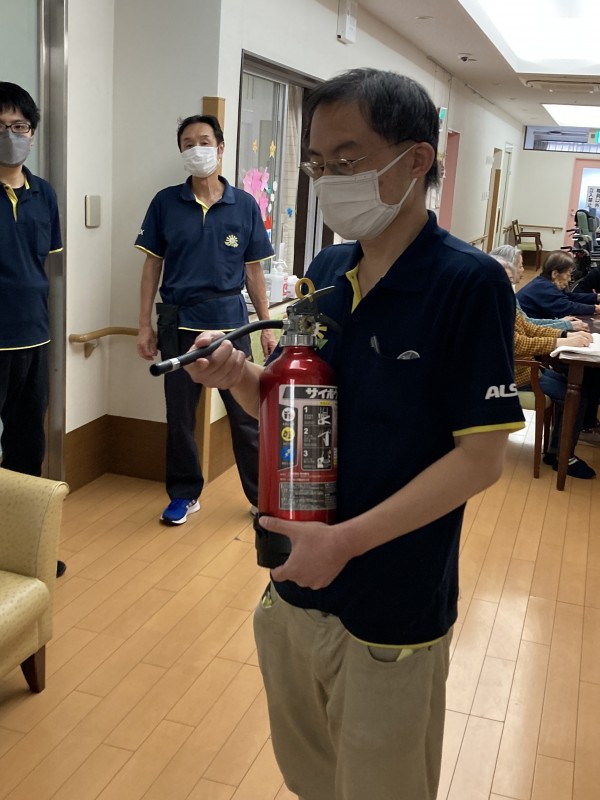 ご利用者様の避難誘導訓練も共に行いました。火災でエレベーターが使用できない状況を想定して訓練しました。今回の訓練は日中のレクの途中での火災を想定しましたので、いつもお過ごし頂いているフロアと違う階で訓練に参加する事になってしまったご利用者様もいました。しかし、いい訓練になったと事後にコメントを頂けました。