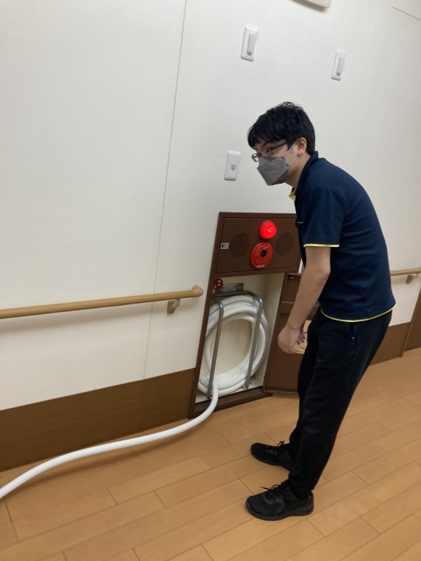 今度は消火栓の使用方法です。消火器は比較的皆様よく目にしますが、消火栓は「ある事は知っていたけど、使い方までは分からない」という職員が多々いました。今回の訓練で消火栓の使用方法についてもしっかり学習しました。