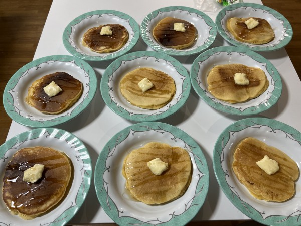美味しそうなホットケーキが完成し、皆様が「わぁー、とても美味しそうですね。色もとても綺麗です。」と仰られ、