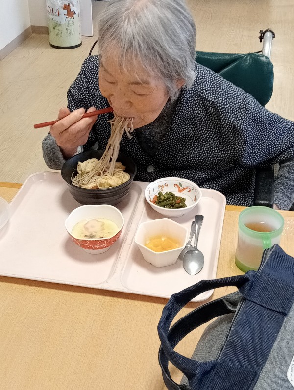 本日の昼食は 海老の天ぷらの入った 温かいお蕎麦でした。