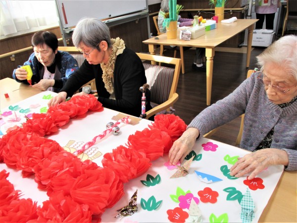 白い模造紙に赤いお花紙で鳥居を作り、両脇に門松も飾りました。