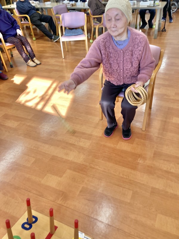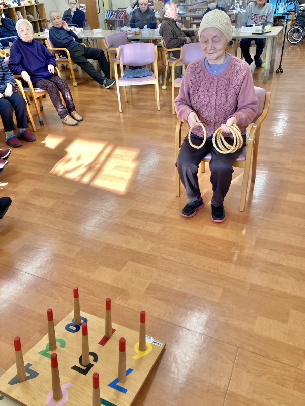 1人9本投げます。通常の輪投げの奥に1本棒を立てており、それは30点のボーナス得点としています。