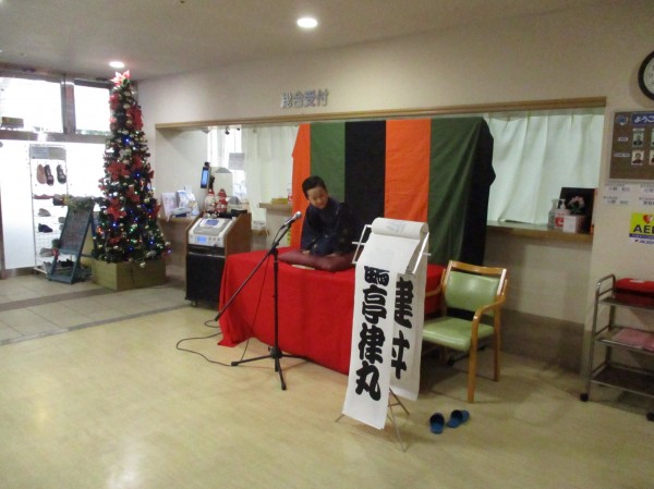 本日のクリスマスメインイベントとして『落語』を催しました。落語ボランテイアの方がそれぞれ『おすわどん』『松山鏡』『牛ほめ』