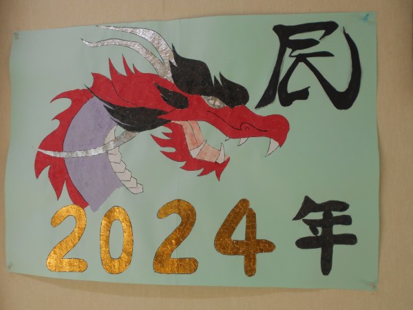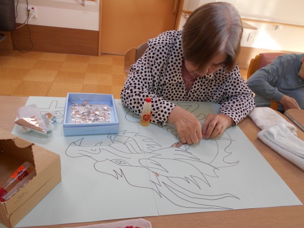 スタッフがペンで辰の絵を書き、そこにご利用者様がちぎった折り紙を貼られております(^^)/