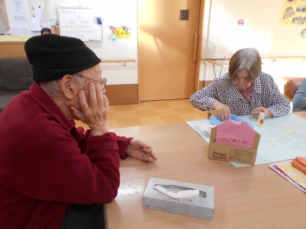 テレビを見ている男性のご利用者様も左の壁画作成のご様子が気になり・・・。