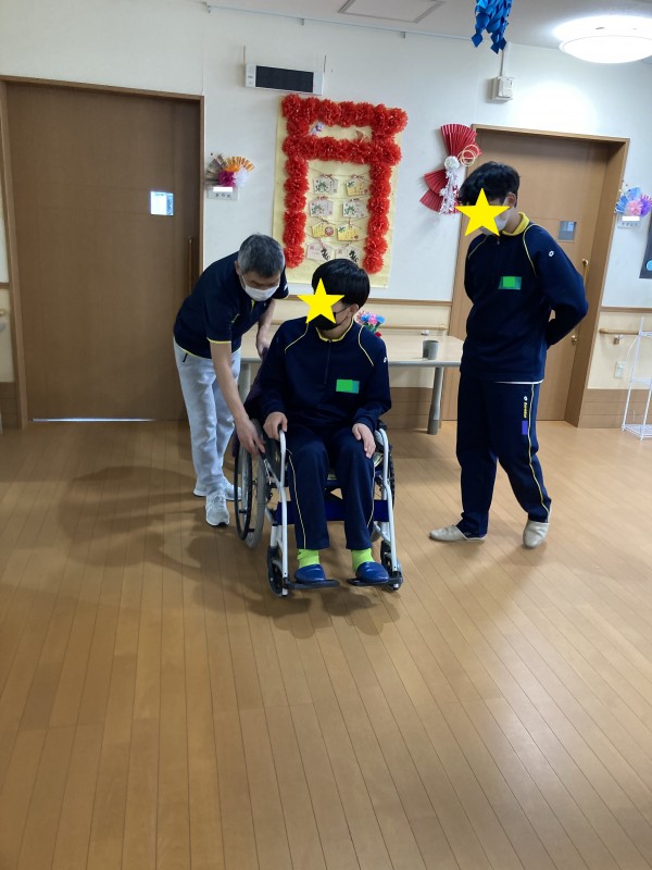 学生の皆さん、車椅子を体験してみましょう(^_^)/