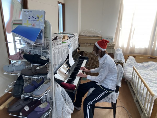 ピアノの伴奏に合わせて「もろびとこぞりて」「ジングルベル」を