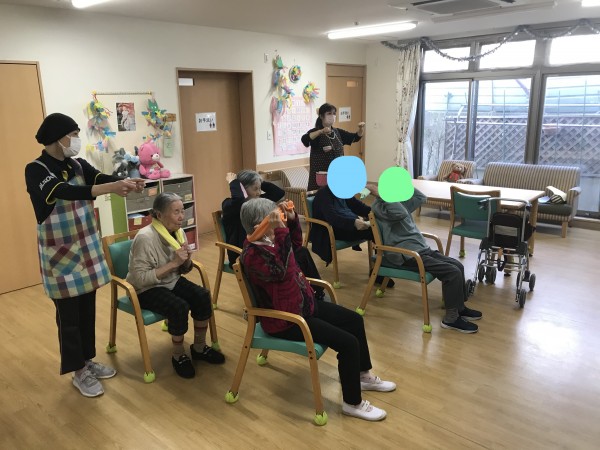 テレビ画面からですので職員もご利用者様に声を掛けながら見本になりながら行う事で