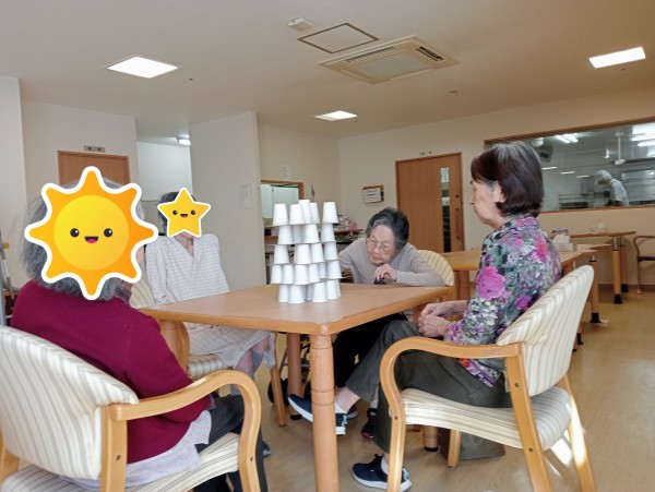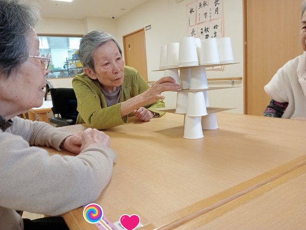 紙コップと厚紙を使って、ジェンガのように引き抜いて積み重ねて、引き抜いて積み重ねて…