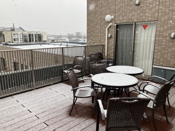 雪がしんしんと降りだしてきました。外がとても静かです。予報通りとはいえ、大雪にならないと良いにですが… アミカの郷川口の周りは薄っすら雪景色です。
