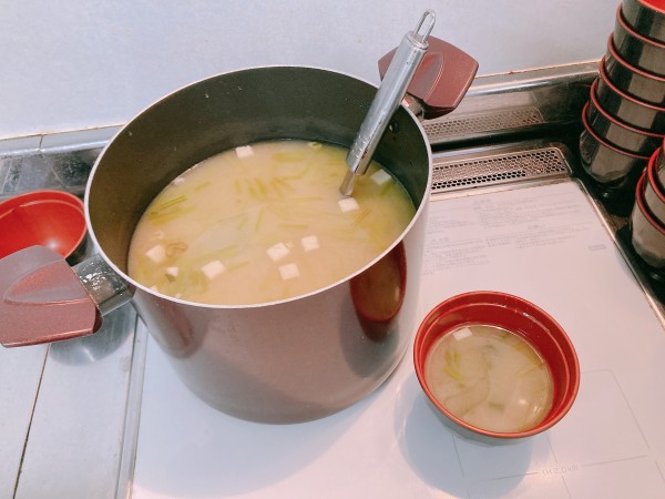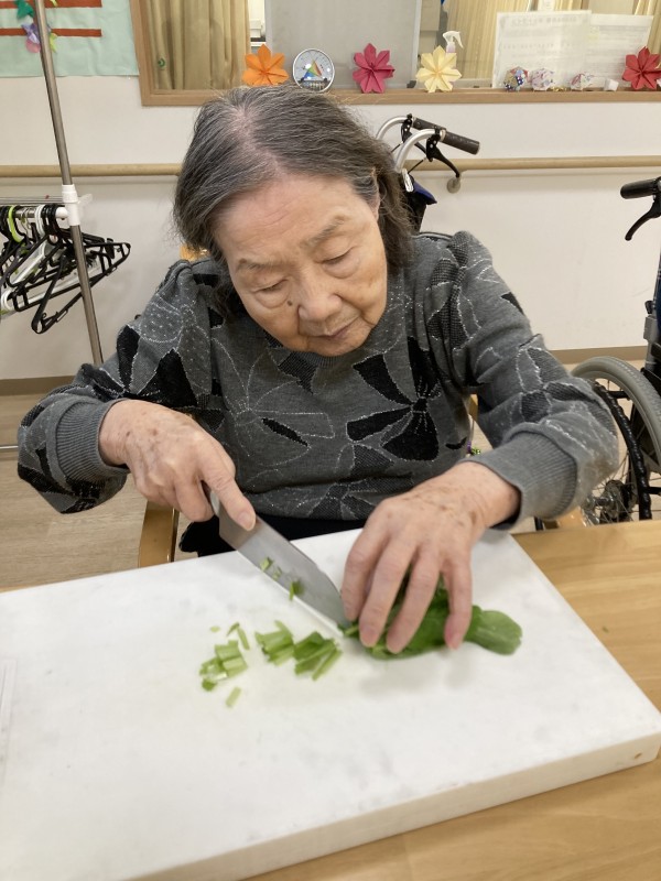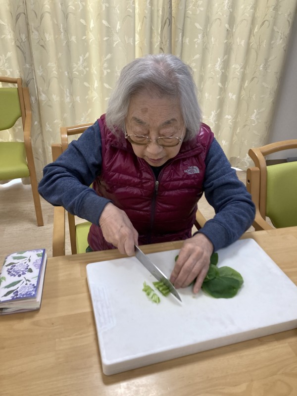 今回は夕食のお味噌汁に入れるほうれん草をお母様方に切って頂きました!