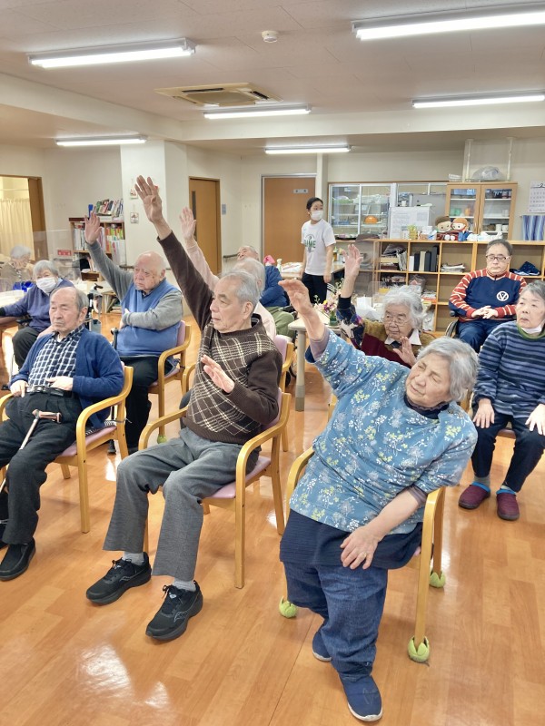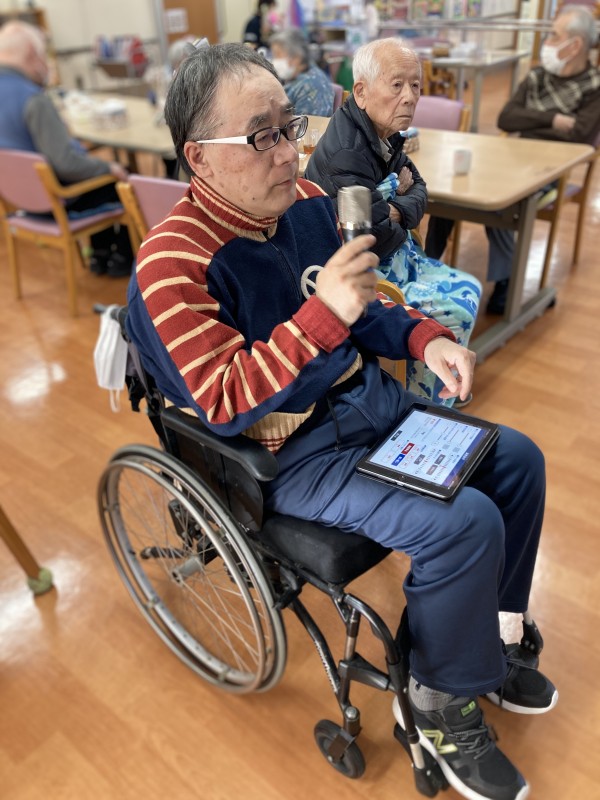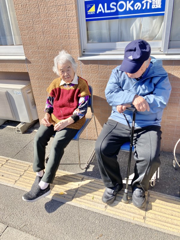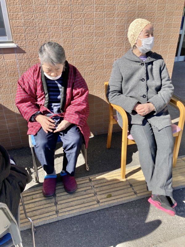 今日は、天気よかったのですが風がとても強かったので施設前で日向ぼっこにしました。