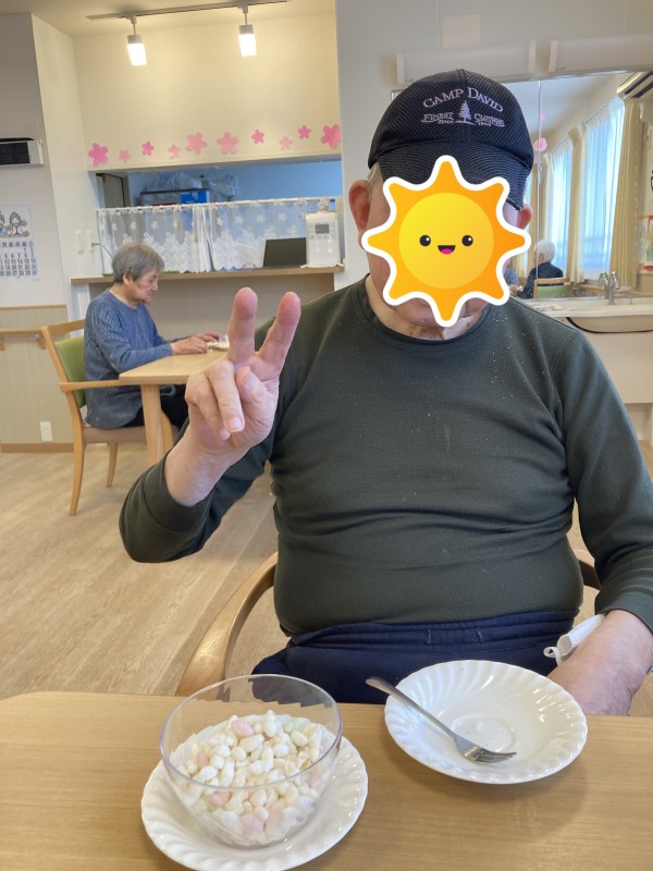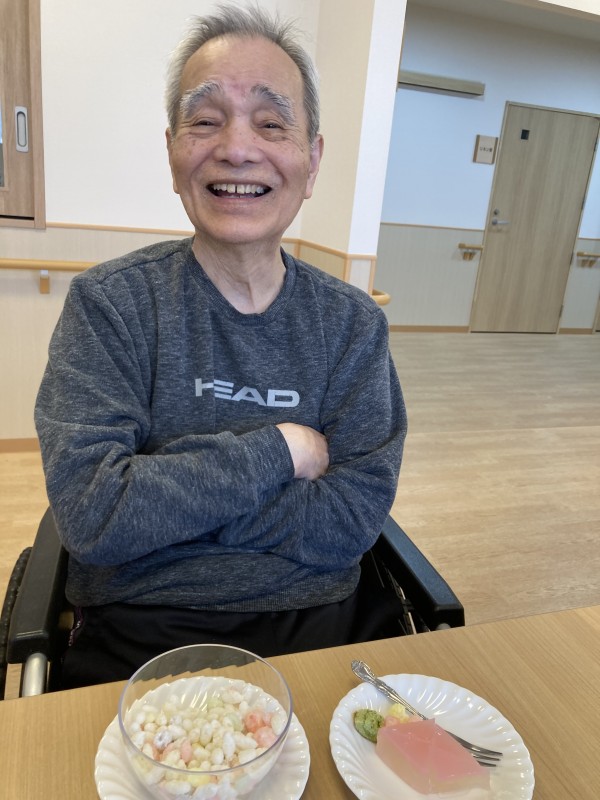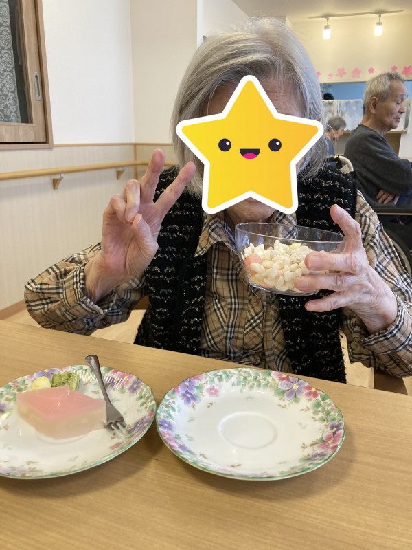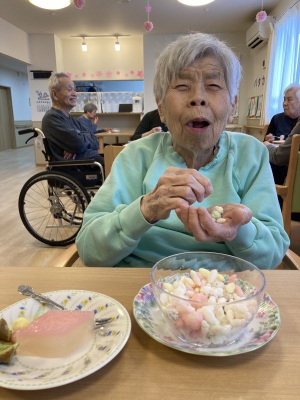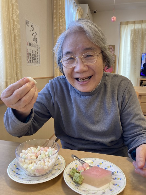 ひな祭りのおやつは「ひなあられ」と「桃ゼリー」を提供させて頂きました!