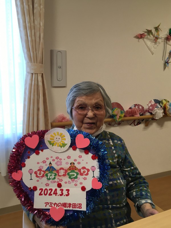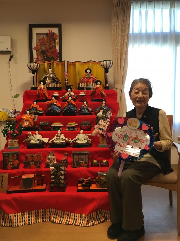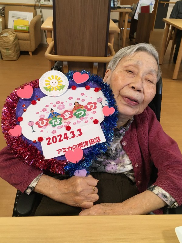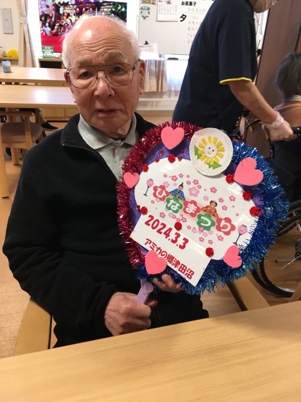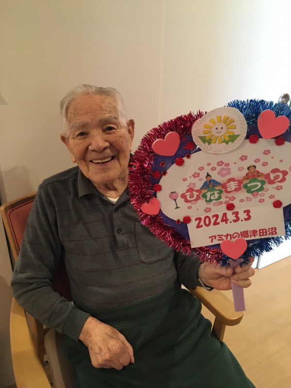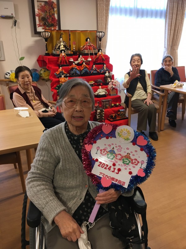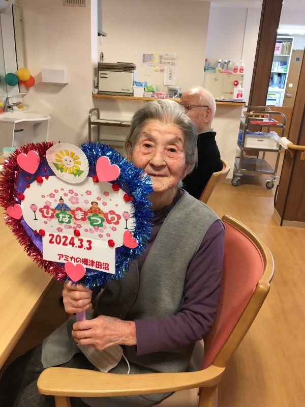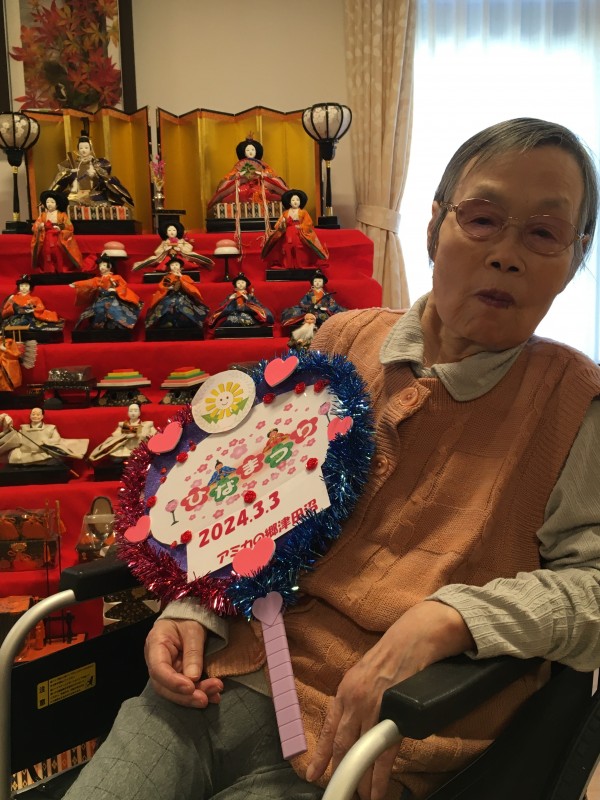 今日は、3月3日でおひなさまですよーと、お声かけしながら、おひなさま団扇を持って、はい!!パチリ(*^^)v