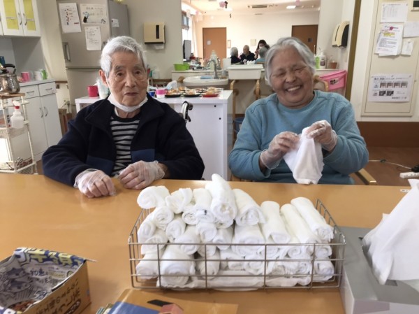 おしぼりを巻くお手伝い中。いつもありがとうございます!
