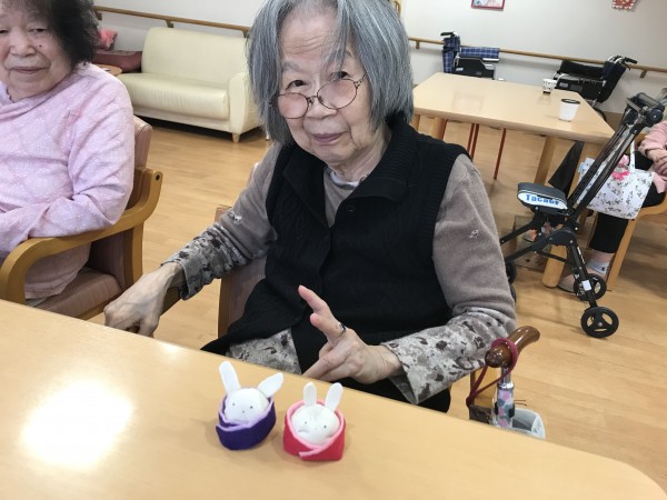 樹脂粘土をつかって、かわいい動物の人形を職員と一緒に手作りしました♪お雛様とお内裏様でしょうか?うさぎが雪うさぎのようでかわいいですね!