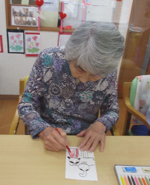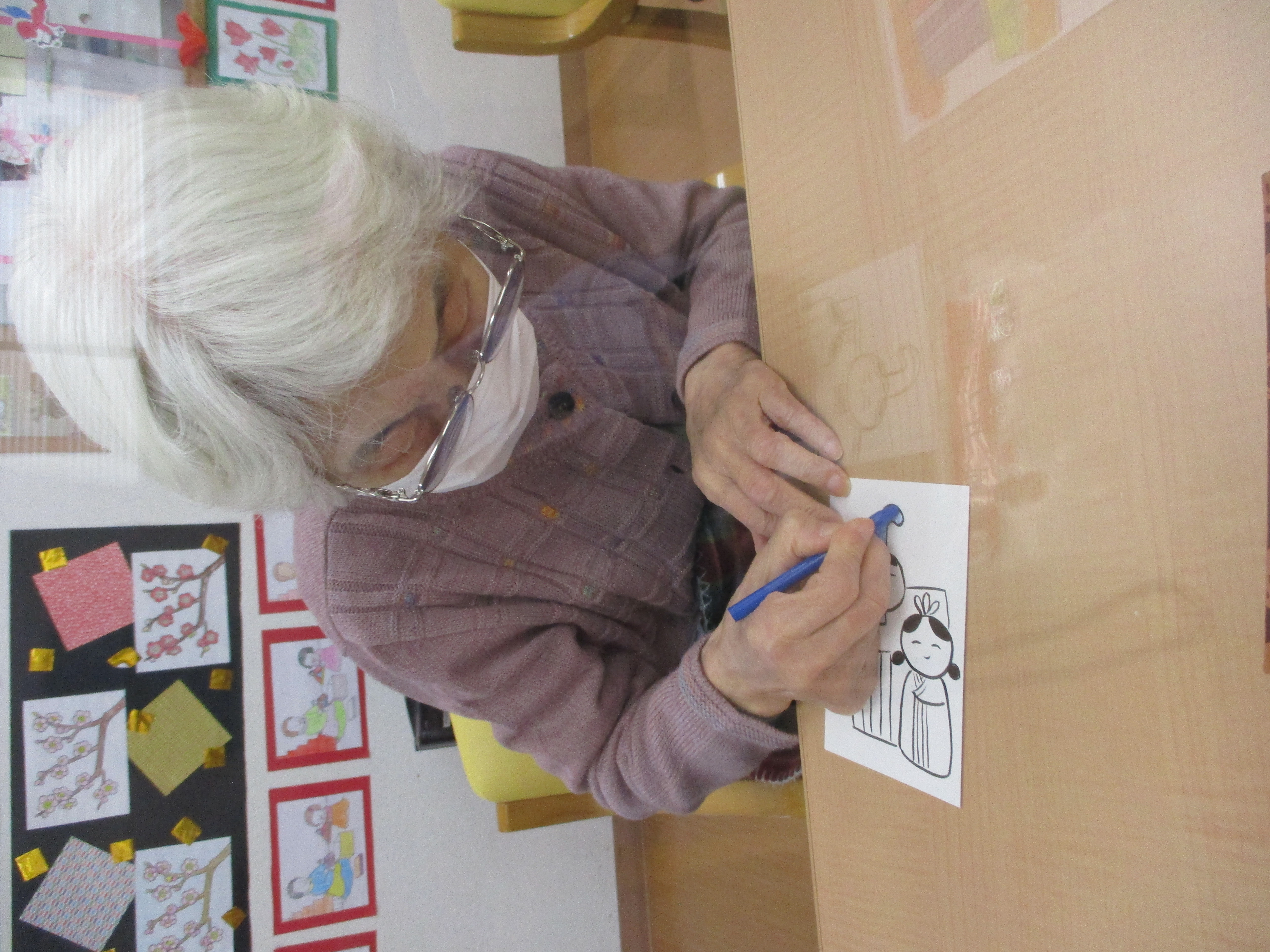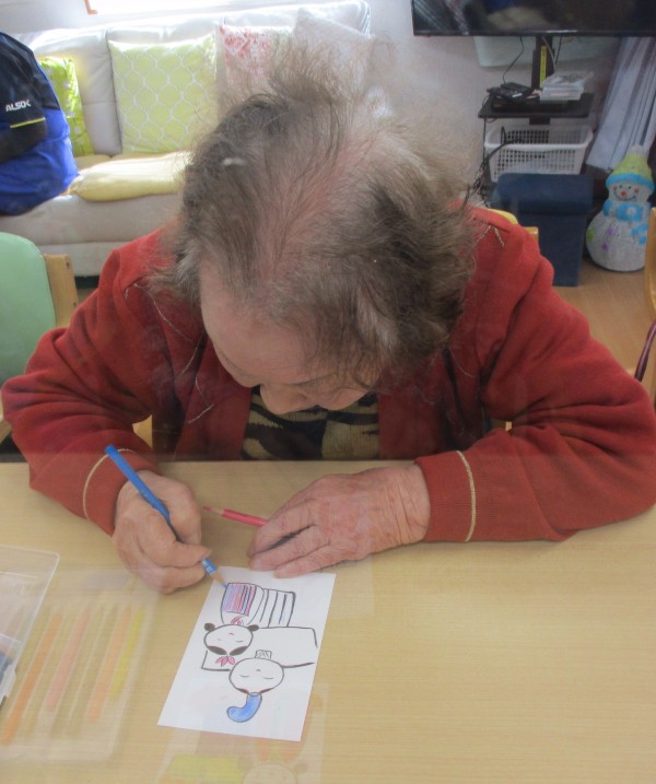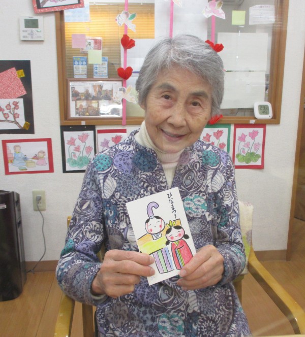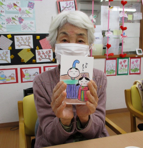 デイサービスかたくりの里大蔵では、ひな祭りの絵手紙制作をしました。
