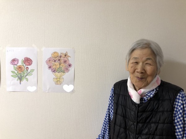「綺麗にできたかな?花束の紙の色を変えたらよかったなぁ~」と もう一枚塗り絵をされました(^^)/