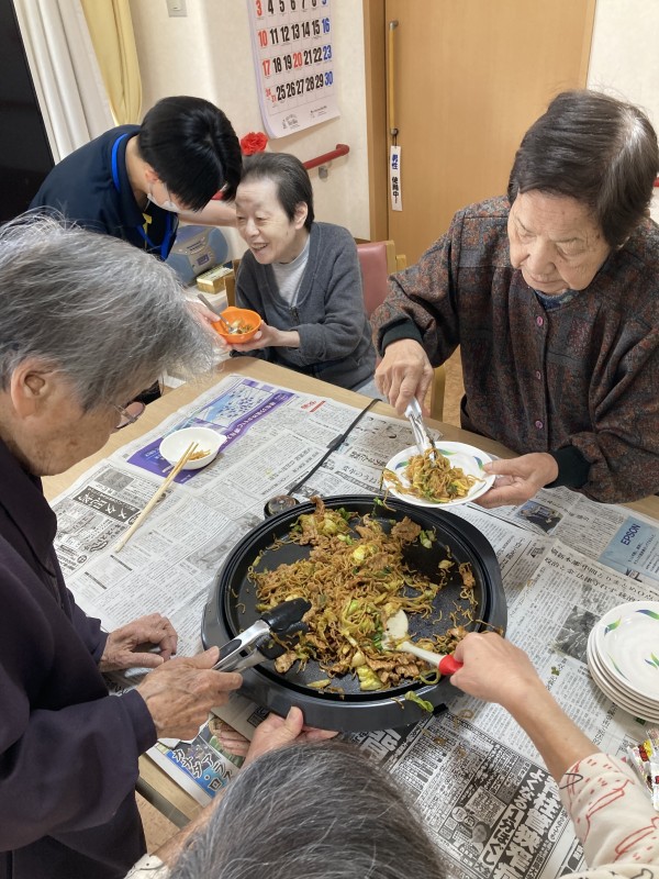 今日の午後はみなさまとスタッフ、みんなで協力してソース焼きそばといちごのミニパフェを作りました!