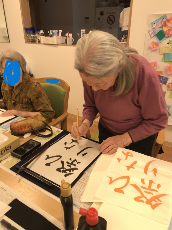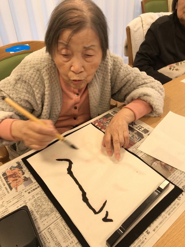 書道師範をもっているI職員が先生となり、みんなへ優しくアドバイスをしてくれました。どうしても書き出しって緊張してしまいますよね。でもいざ書き始めるとスイスイと書き上げることが出来ました!感無量の表情?!
