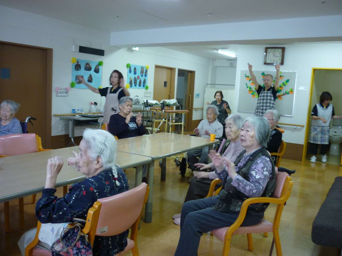 家族会を開催中、別フロアで御利用者様、スタッフで、ノア体操、ラジオ体操を元気いっぱい手、足、腰を動かしました。