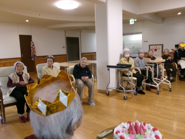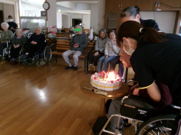 今月がお誕生日のご入居者様へ「おめでとう~」「おめでとうございます!」と皆さまより、祝福と拍手です!