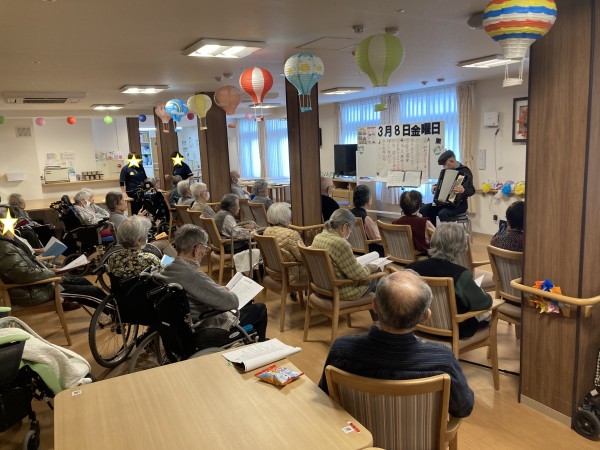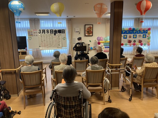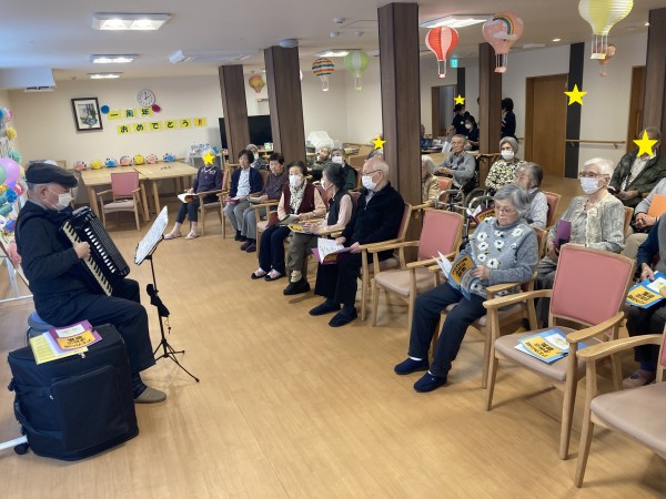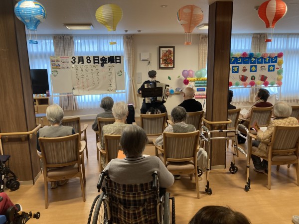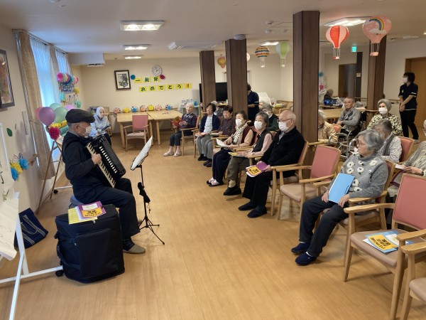 初めて、地域でボランティア活動しているアコーディオンの先生をお呼びしました!(^^)!アコーディオンの曲は昔懐かしい名曲ばかりで利用者様も懐かしみながら歌ってみたり、曲に聞き入っていました。