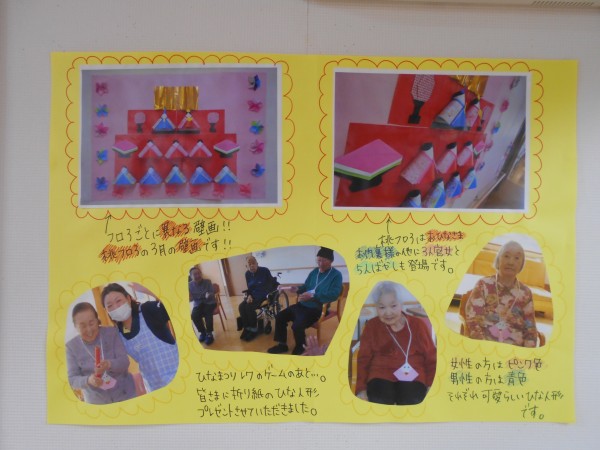 レクではちぎり絵や体操、行事は季節に合わせたものを実施することが多いです。