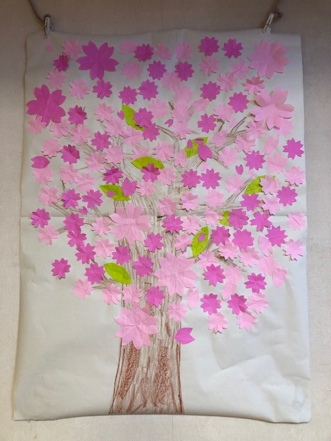 次に、先日折り紙で作った桜の花びらを貼っていきます。