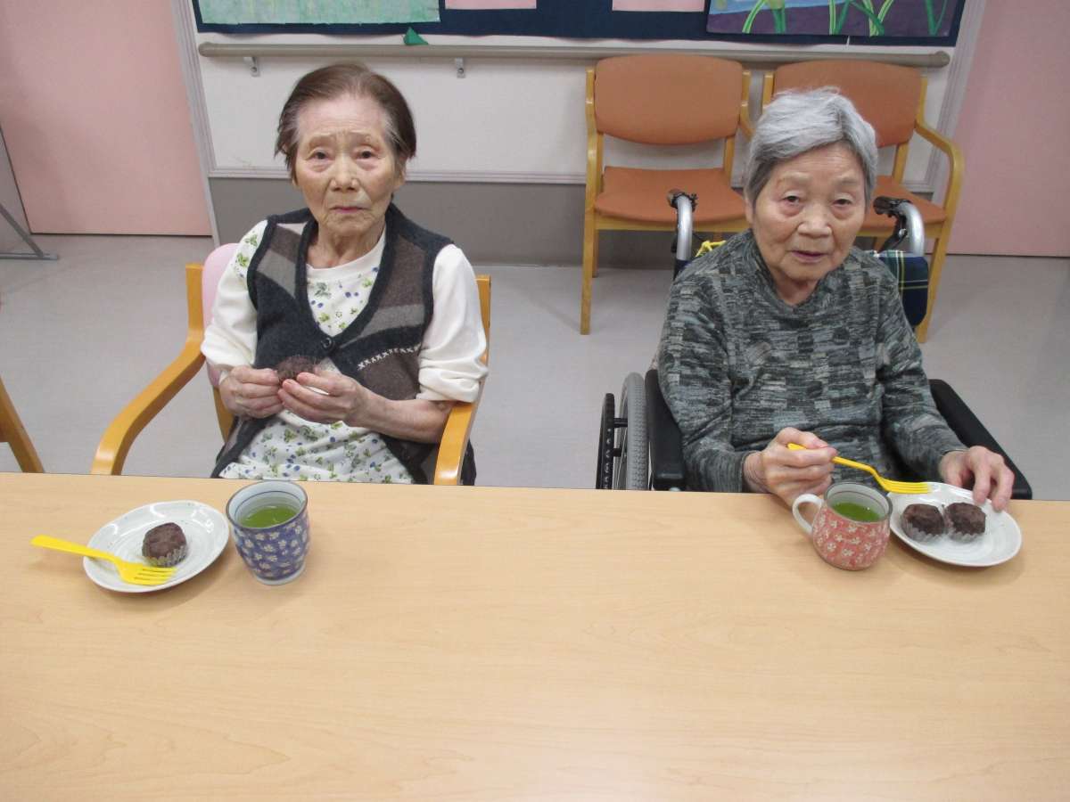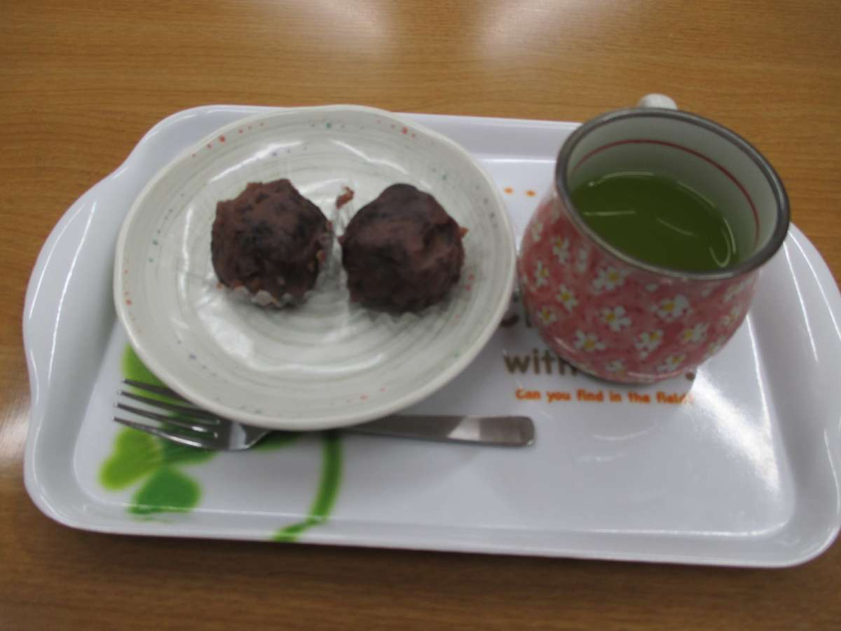 明日は十五夜です。ご利用者様は本日お彼岸のおはぎを試食中
