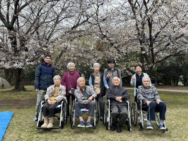 最後の班の皆さんは雨が降ってしまい思うようにお花見が出来ず残念でしたが、屋根の下からの桜を眺め、職員の連れて来たワンちゃんと戯れていました。