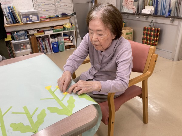 大戸公園の桜が咲く日を楽しみにしているご利用者様と本日は4月の壁画を作成しました。