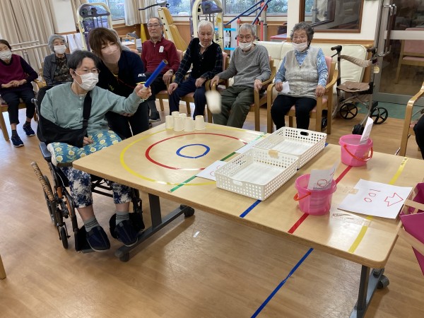紙コップをカゴの中に入れて点数を競うゲームです。