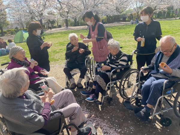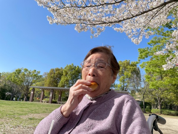 桜並木に囲まれた原っぱで桜を鑑賞した後は桜の木の下でおやつを食べました♪