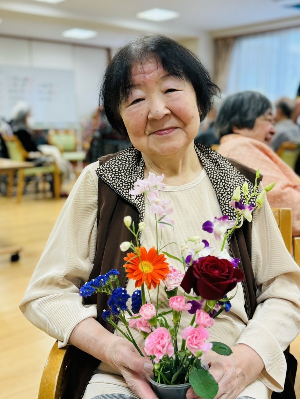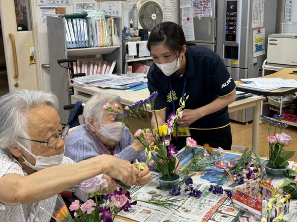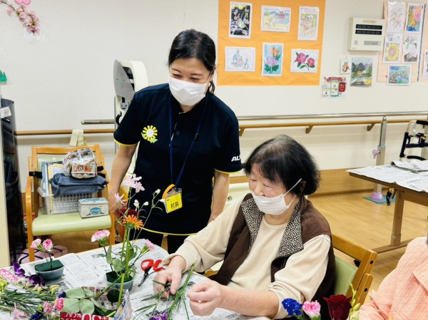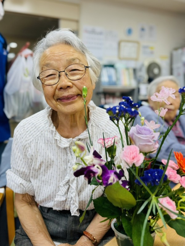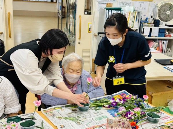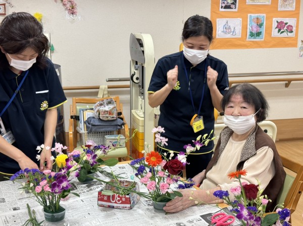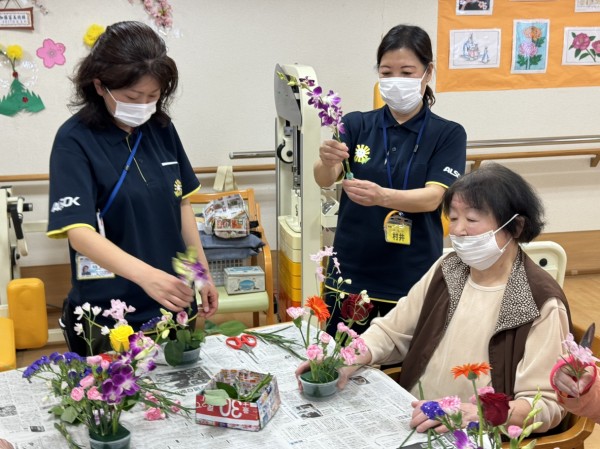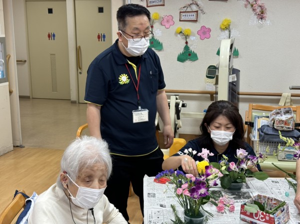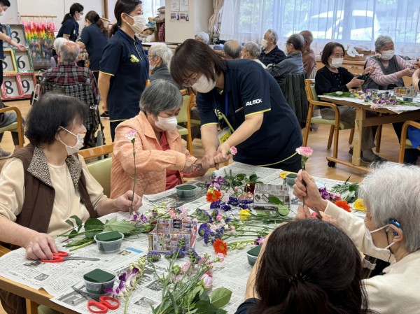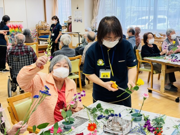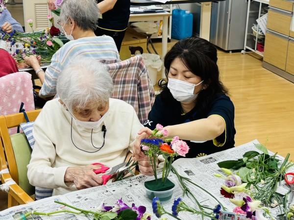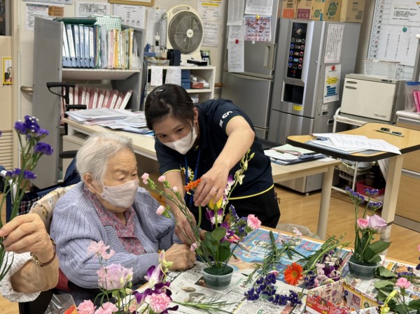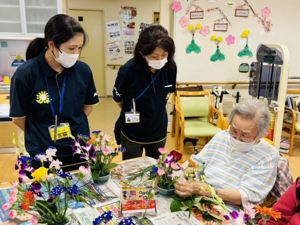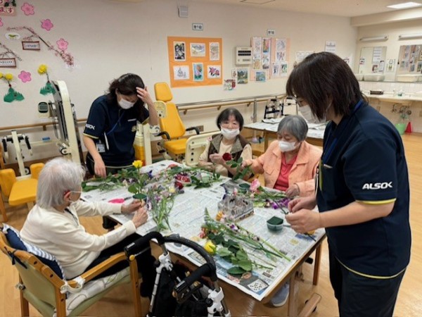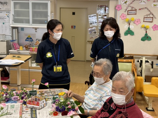 特別合同企画(デイサービス遊・西東京とデイサービスひばりが丘)です! 皆様楽しみにされていました企画です。まず、新聞を下に敷き切り花や『オアシス』等、材料をテーブルの上に準備しました!