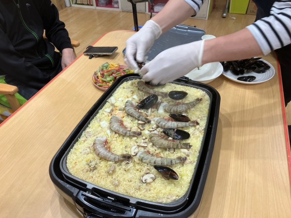 シーフードのいい香りにフロアー内が包まれて、皆口々に「早く食べたいね〜」と!彩の綺麗な海鮮パエリアが完成して、フタを開けると皆さん歓声をあげていました‼️