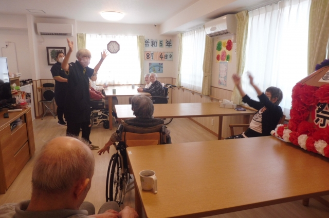食事前、おしゃべりも体操です。