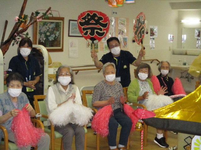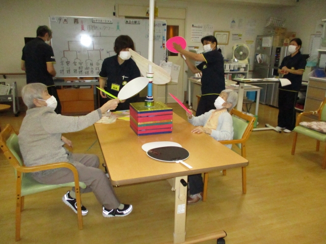 今日のレクレーションは『田無タワー』です! 団扇で扇いで・・・頑張れ!
