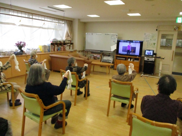 zoom運動教室!テレビの中のインストラクターと共にタオル体操です!!