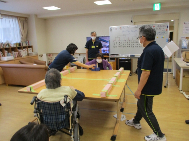 今日の運動レクレーションは『テーブルホッケー』です!負けないぞ!