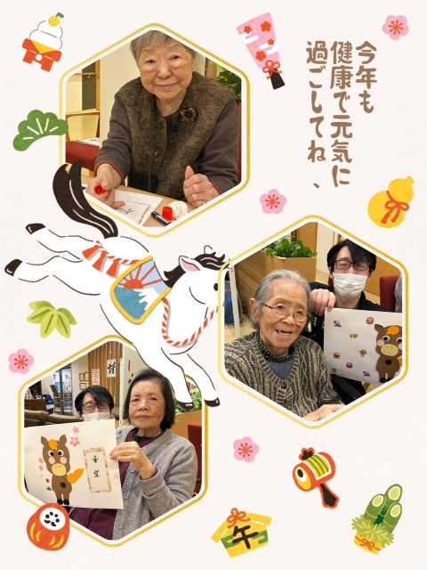 【アミカの郷ちとせ】謹賀新年(^^♪かるた・羽子板大会、思いを込めて可愛い福笑いが出来ました。